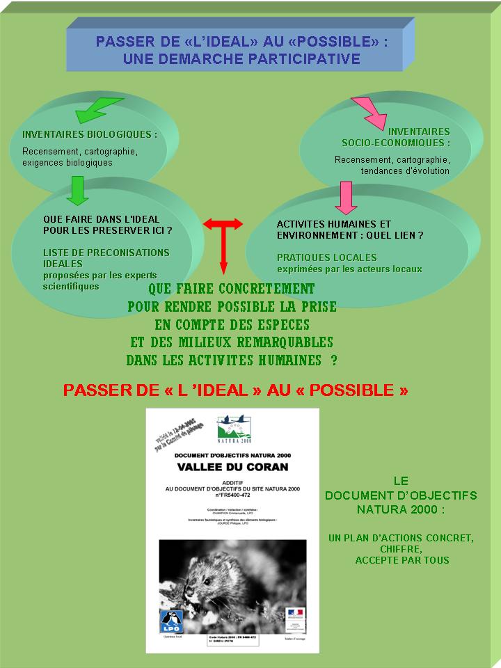 Au sein des commissions thématiques et du Comité de Pilotage, les acteurs locaux vont suivre un schéma de réflexion qui va les amener à comprendre pourquoi les espèces rares ailleurs, sont encore présents chez eux, et à faire les bons choix pour assurer leur préservation à l’avenir à travers les activités humaines existantes ou à venir.