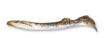 - Description : La Lamproie marine à la forme d’une grande anguille jaunâtre marbrée dorsalement de brun. En arrière des yeux s’ouvrent sept paires d’orifices respiratoires. La bouche est en forme de ventouse couverte de dents cornées jaunâtres. La deuxième nageoire dorsale est contiguë à la caudale. La larve est dépourvue d’yeux.